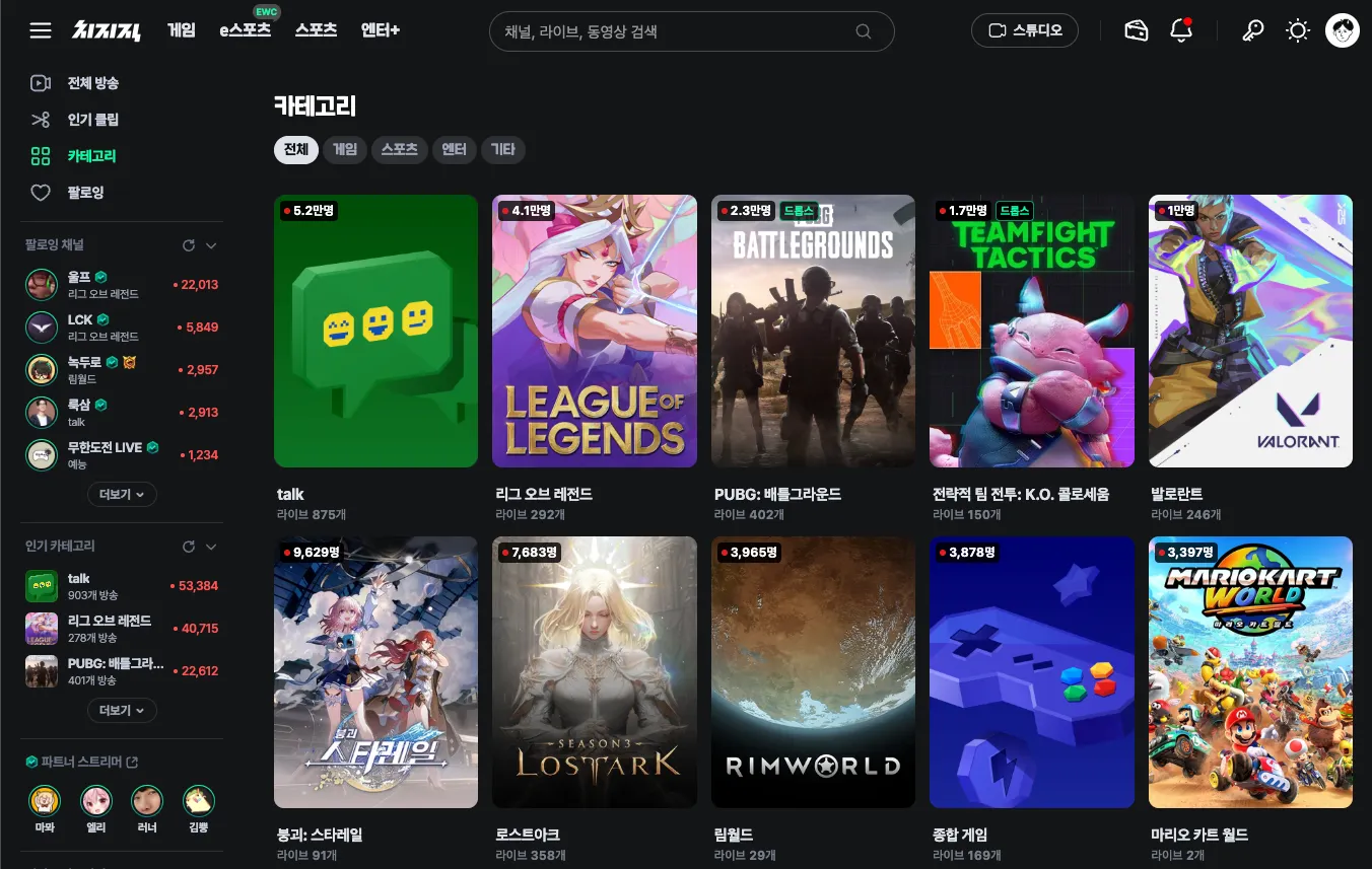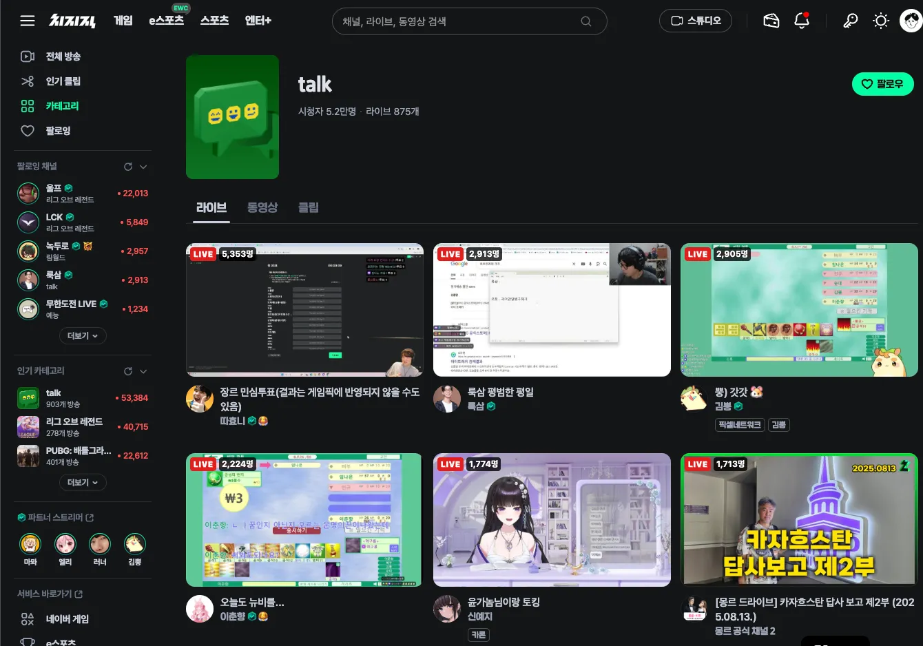 아래와 같이 방송 플랫폼의 카테고리 내에 존재하는 방송중인 채널들에 대하여 UUID를 수집하기만 할 수 있으면 되므로 채널 수집에 대한 부분은 크게 문제가 없을 것으로 보인다.