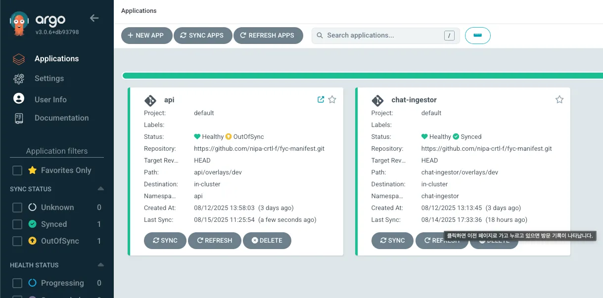 [argocd - Applications - api - 생성되어있는 pod를 클릭하면 로그 확인 가능]