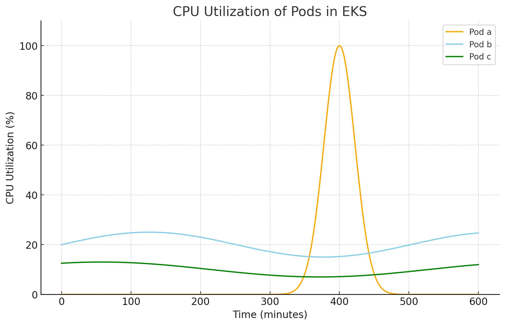 이렇게 되면 오토스케일링에도 문제가 생기는데. 실제로 아래와 같이 Pod a 인스턴스 부하가 생겨도 평균치가 오토스케일링 기준값에 도달하지 못해서 오토스케일링되지 못하거나, 오토스케일링되기전에 인스턴스 부하로 메시지 유실률이 발생할 수 있다.