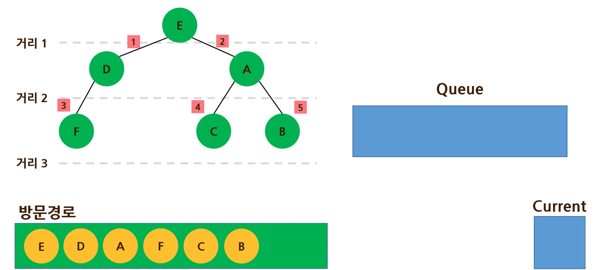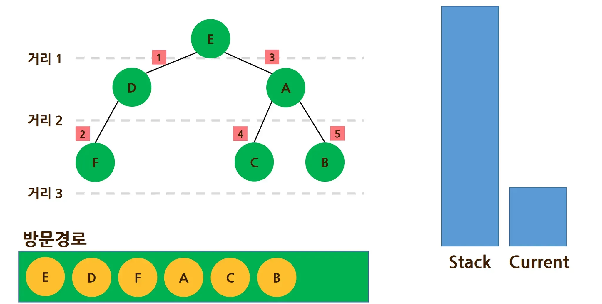 노란색 노드는 아직 방문하지 않은 노드, 초록색 노드는 방문한 노드이며, 스택에 담겨서 Current로, Current에서 방문경로로 이동하는 순간 그 노드와 연결되어 있던 노드들이 스택(Stack)으로 들어가게 된다.(문제 5번 설명 참고)노란색 노드는 아직 방문하지 않은 노드, 초록색 노드는 방문한 노드이며, 스택에 담겨서 Current로, Current에서 방문경로로 이동하는 순간 그 노드와 연결되어 있던 노드들이 큐(Queue)로 들어가게 된다.(문제 5번 설명 참고)