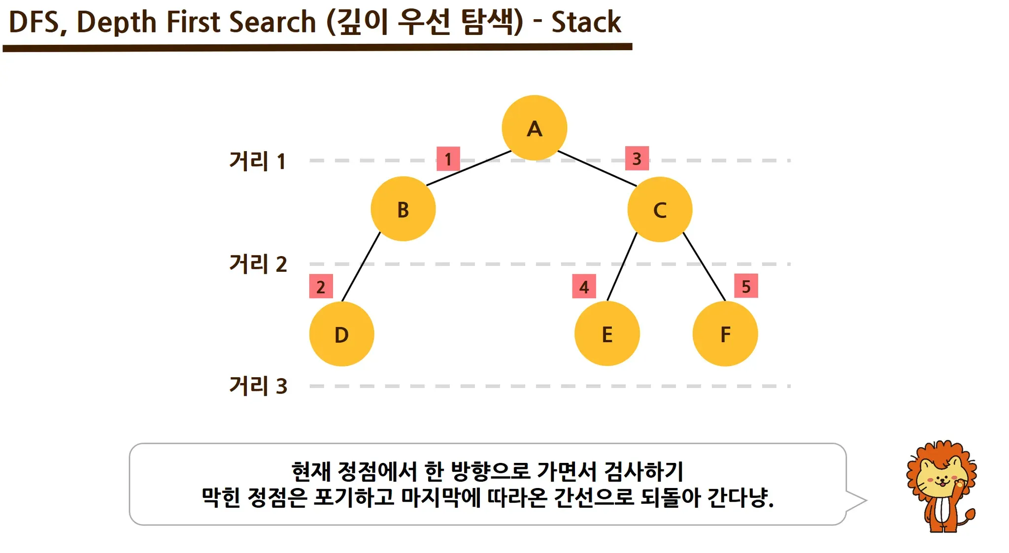 깊이 우선 탐색은 스택(stack)을 사용해서 탐색한다.
