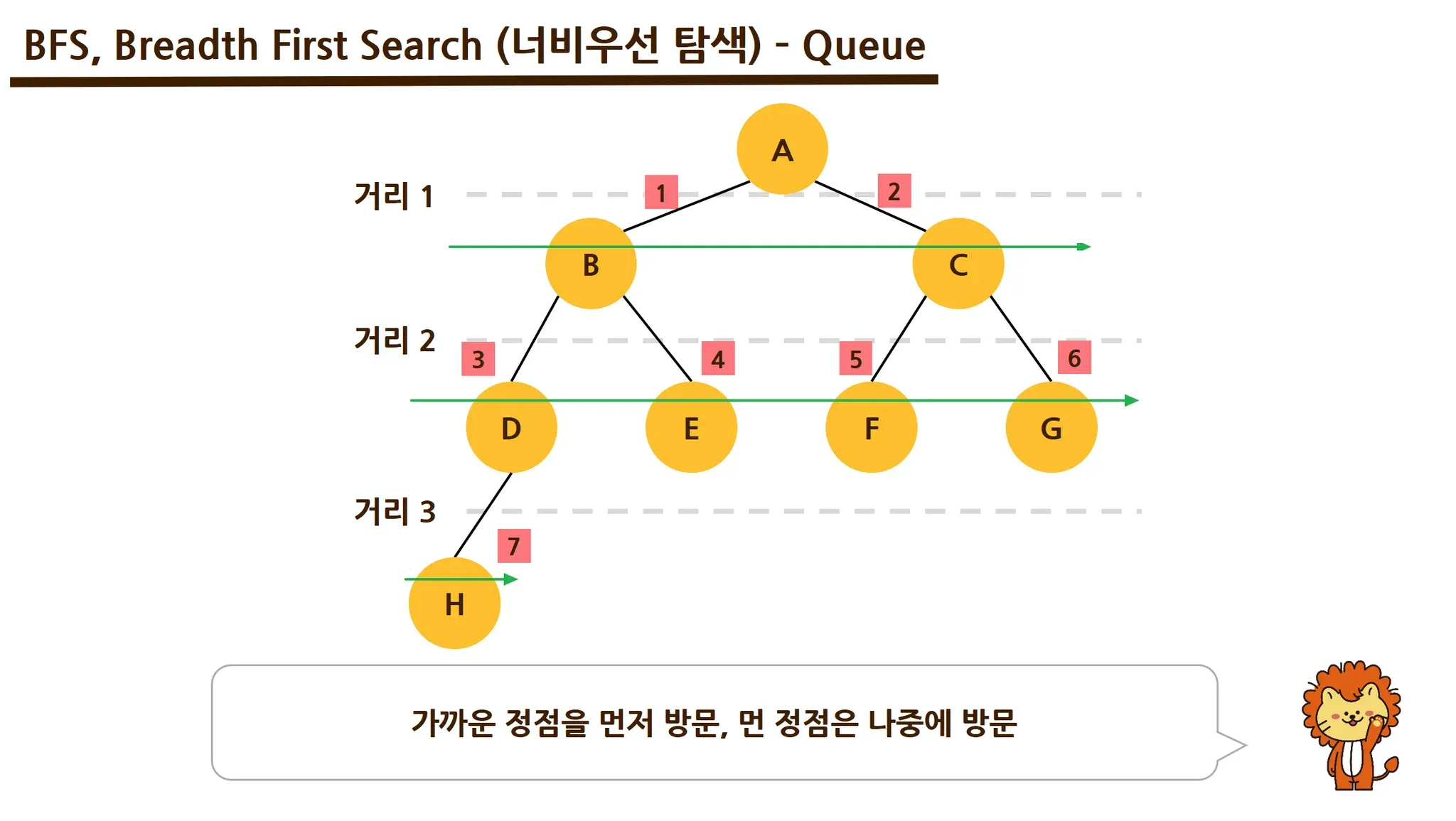 너비 우선 탐색(Breadth-first search, BFS)은 맹목적 탐색방법의 하나로 시작 정점을 방문한 후 시작 정점에 인접한 모든 정점들을 우선 방문하는 방법이다. 더 이상 방문하지 않은 정점이 없을 때까지 방문하지 않은 모든 정점들에 대해서도 너비 우선 검색을 적용한다. OPEN List 는 큐를 사용해야만 레벨 순서대로 접근이 가능하다. (출처 :https://ko.wikipedia.org/wiki/너비_우선_탐색)